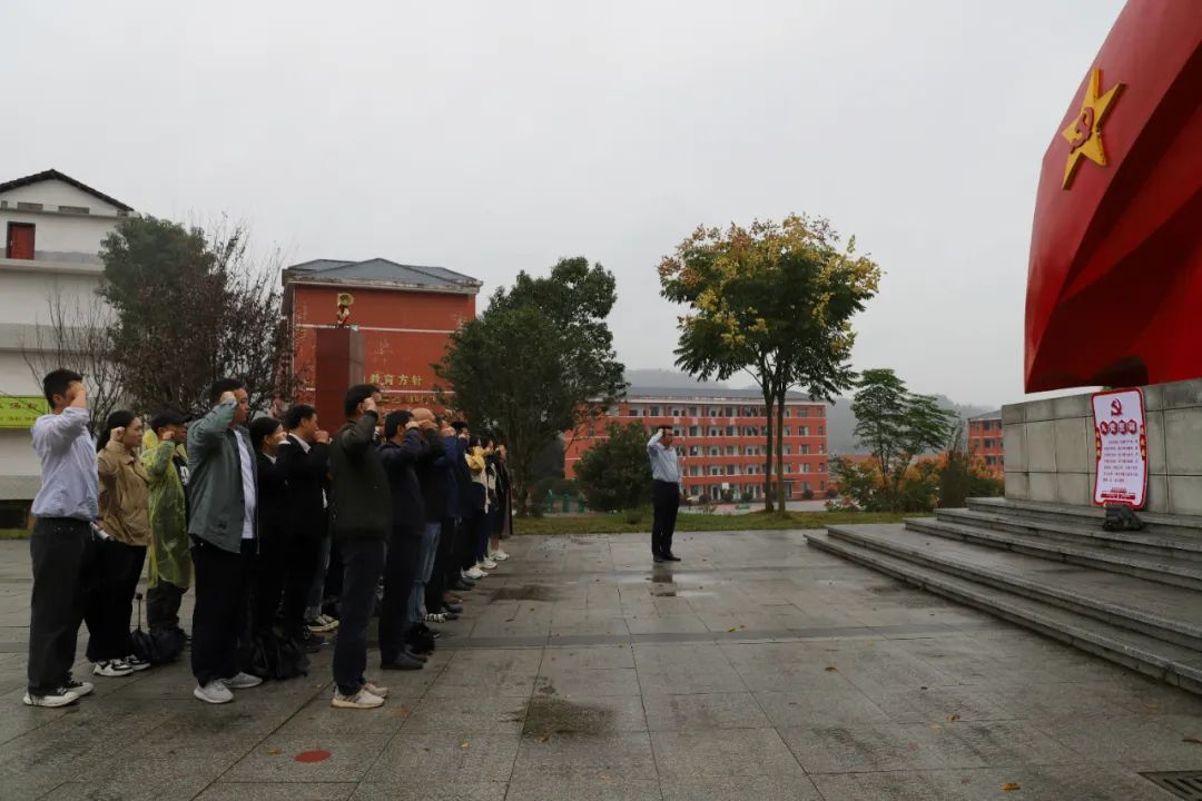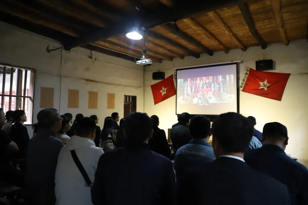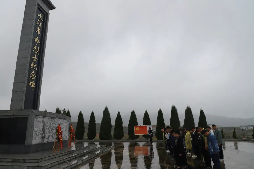 全體黨員干部冒雨前往梓華廣場(chǎng)、水江紅色教育館、水江鎮(zhèn)革命烈士陵園、上洞村列寧小學(xué)等革命老區(qū)紅色教育點(diǎn),在黨旗前重溫入黨誓詞;共同參觀水江紅色歷史展,并上了一堂“烈火忠魂——致敬平凡而又偉大的英雄周鵬”微黨課,在“行走”中聆聽革命故事;向革命烈士莊重敬獻(xiàn)花籃、鞠躬默哀,集體瞻仰革命烈士紀(jì)念碑,告慰忠魂、寄托哀思;聆聽列寧小學(xué)“紅色教育史”,感受陳列墻上蘇區(qū)時(shí)期“紅色標(biāo)語(yǔ)”,置身教室觀看“永遠(yuǎn)的豐碑——水江蘇區(qū)革命斗爭(zhēng)紀(jì)實(shí)”紀(jì)錄片。大家通過(guò)重溫革命征程、緬懷抗戰(zhàn)先烈、銘記民族歷史,實(shí)地感悟共產(chǎn)黨員的初心使命,深刻領(lǐng)悟偉大建黨精神蘊(yùn)含的真理力量,堅(jiān)定永遠(yuǎn)跟黨走的理想信念。