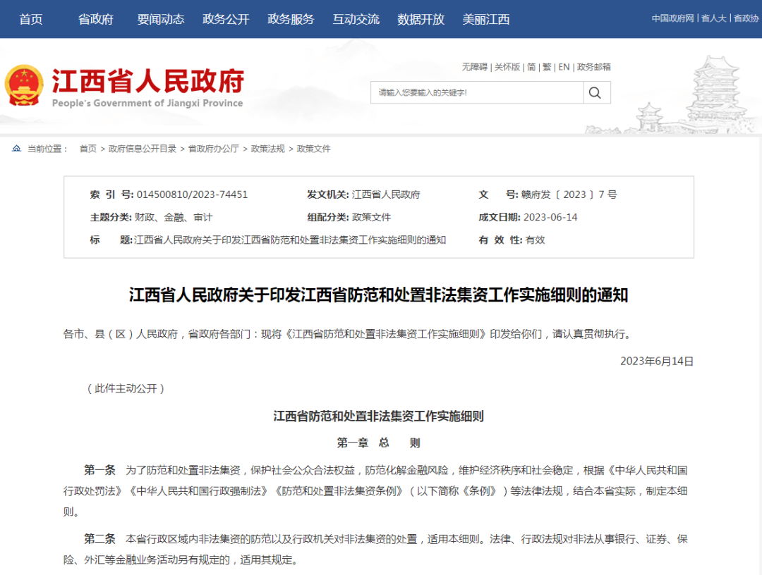 江西省人民政府關(guān)于印發(fā)江西省防范和處置非法集資工作實施細則的通知
