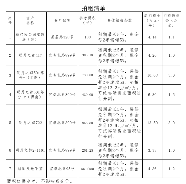 畫眉路328號松江園公園管理房(南),宜春北路899號明月之都部分資產(chǎn),宜春北路95號原軍轉(zhuǎn)大廈樓下2間店面及地下室。