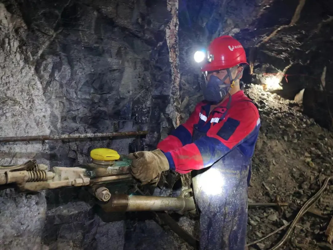 現場安全確認后,華攸勝熟練地操作起風鉆,反復調試。安全帽上礦燈打出的光柱,隨著他的動作,在巖壁上不斷移動著。在白色礦脈找到鉆點后,他穩(wěn)穩(wěn)地舉起風鉆,隨著“嗒嗒”聲響起,鉆桿旋轉搖晃,塵霧逐漸彌漫……