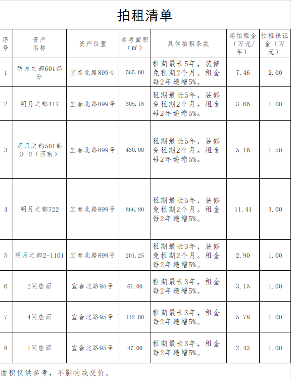 一、拍租標(biāo)的:宜春北路899號(hào)明月之都部分房產(chǎn)、宜春北路95號(hào)一樓店面,詳情見本公司拍租清單。