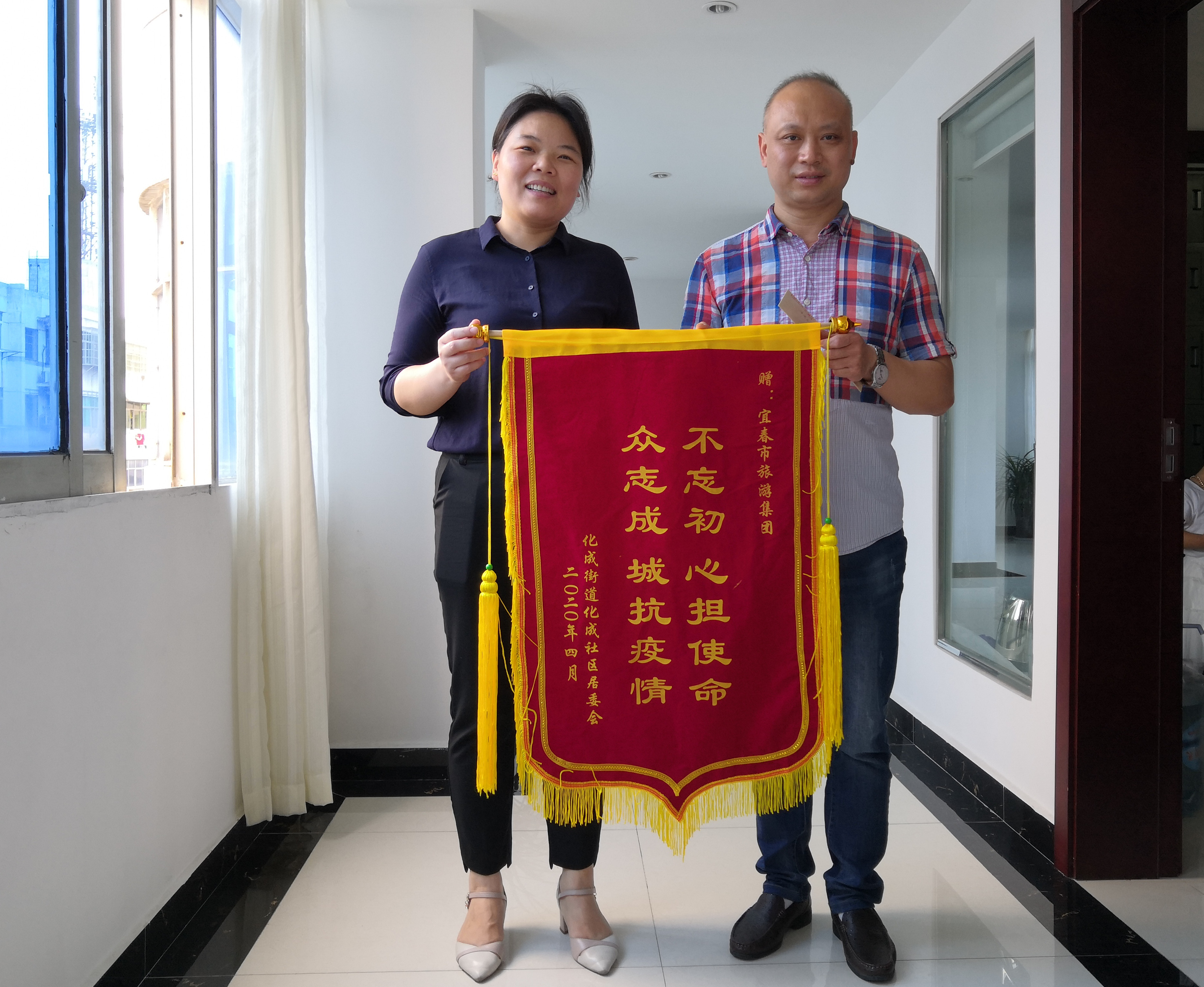 2020年5月28日下午,宜春市袁州區(qū)化成街道化成社區(qū)干部來到集團(tuán)公司,為公司在新冠肺炎疫情防控期間開展“雙進(jìn)雙服務(wù)” 工作送來錦旗,并給公司黨員、副縣級(jí)干部易民同志寫來感謝信,對(duì)其在參加化成社區(qū)志愿者服務(wù)工作中做出的努力和奉獻(xiàn)表示感謝。