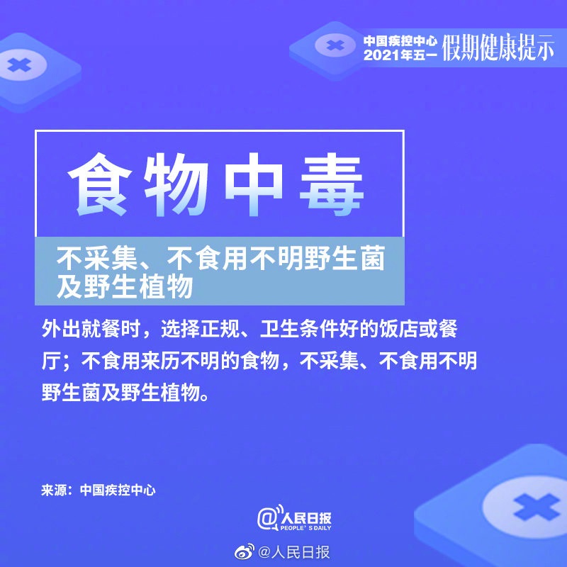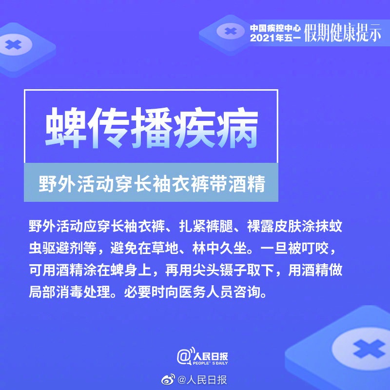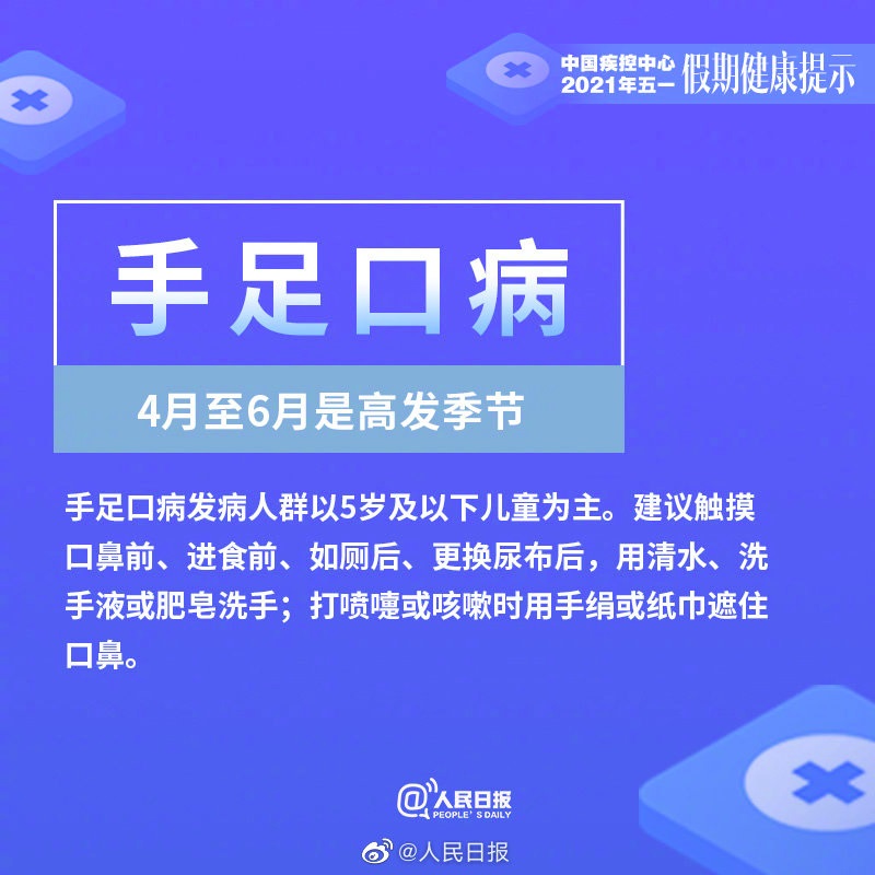 “五一”假期臨近,中國(guó)疾病預(yù)防控制中心通過官方微信公眾號(hào)發(fā)布健康提示,建議重點(diǎn)做好新冠肺炎、諾如病毒腸炎、手足口病、蜱傳播疾病、動(dòng)物傳播疾病和食物中毒的預(yù)防與防范。