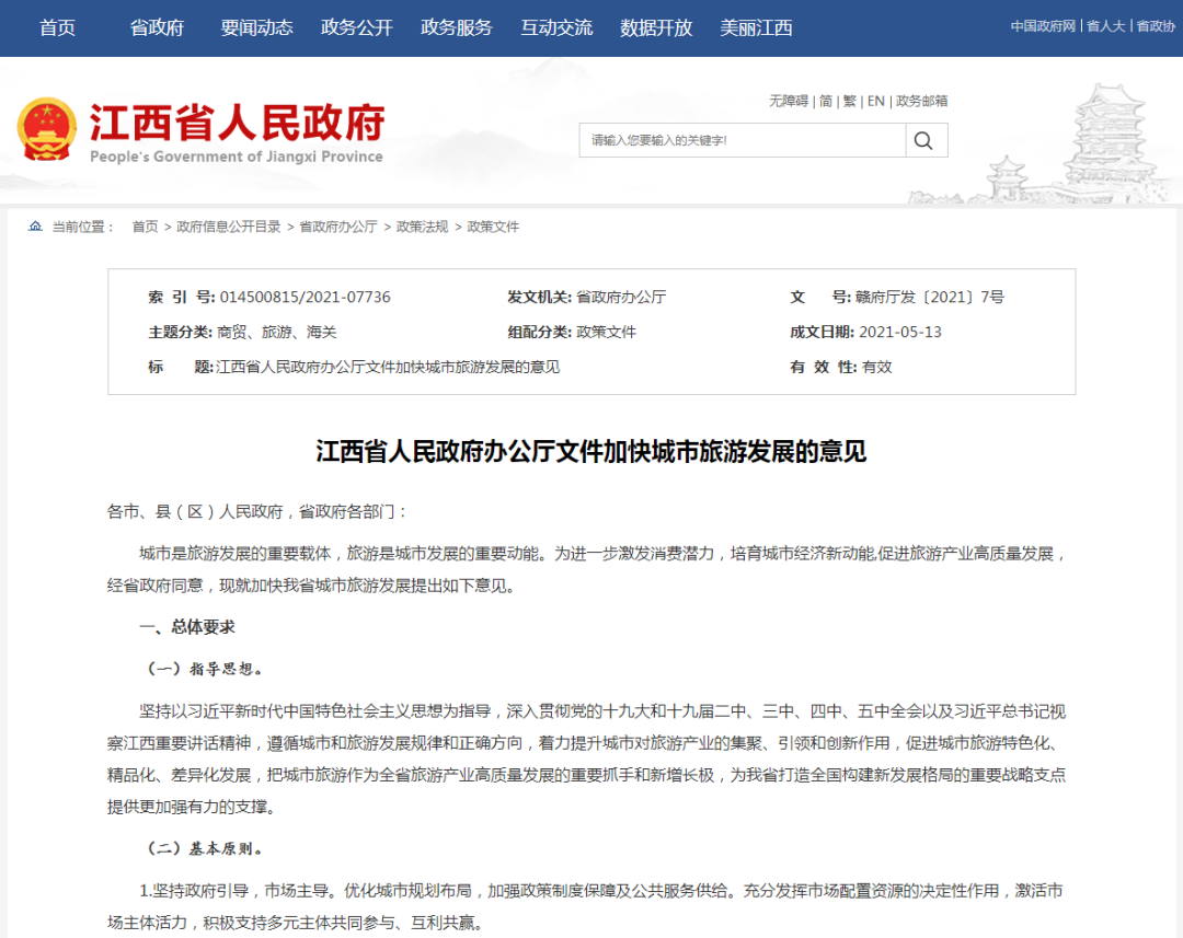 江西省人民政府辦公廳關于加快城市旅游發(fā)展的意見