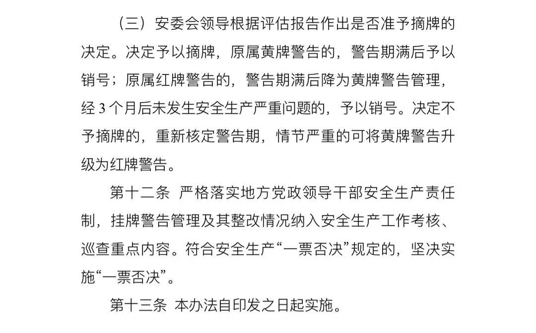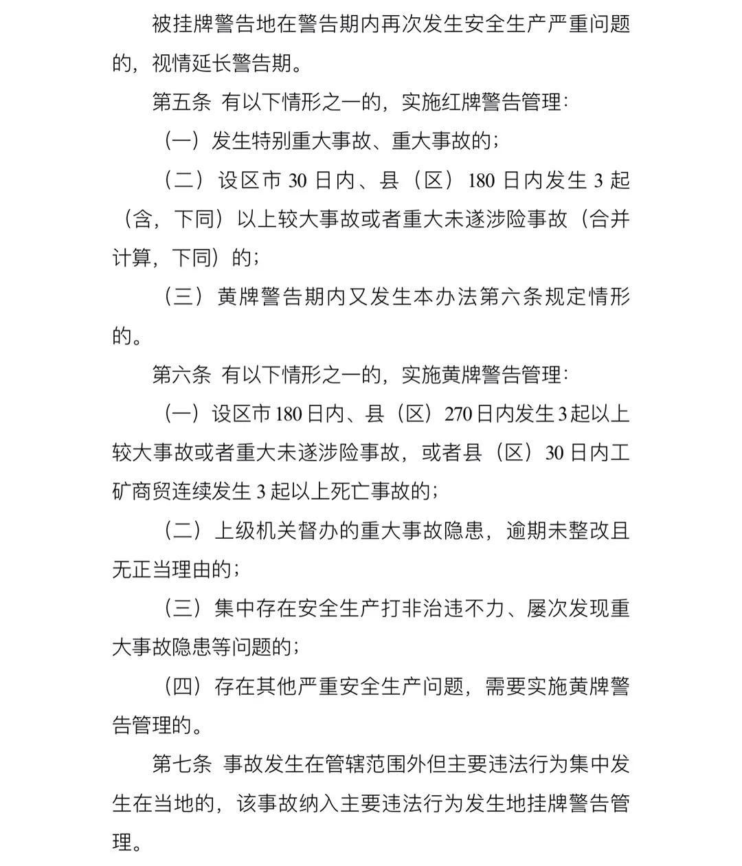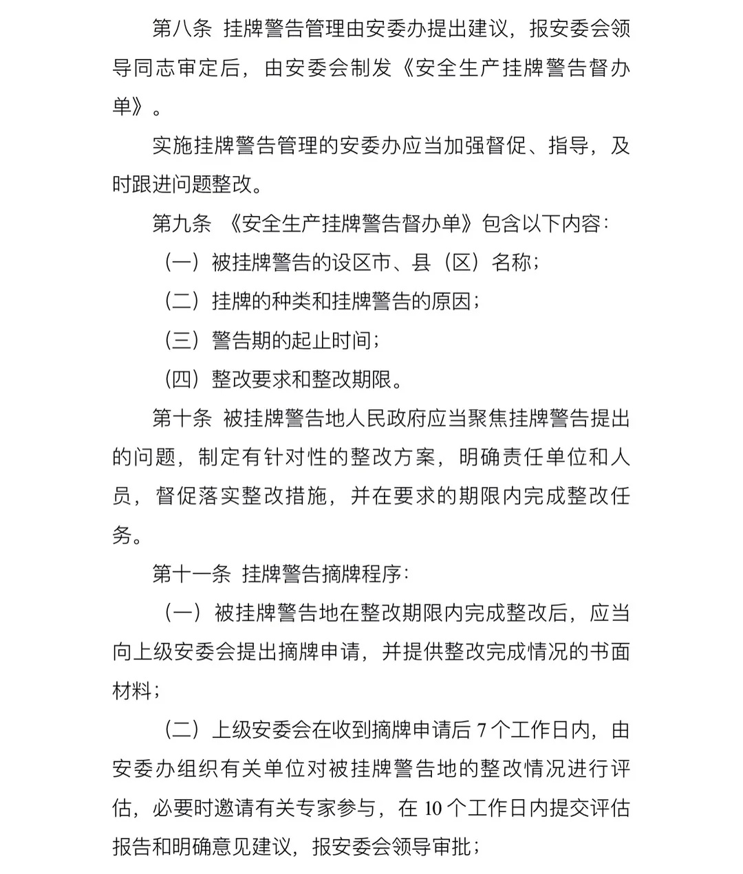 二是與安全生產(chǎn)約談制定相銜接。約談的對象是黨政領(lǐng)導(dǎo)干部,掛牌警告的對象是地區(qū),二者相互協(xié)同,織密安全生產(chǎn)責(zé)任網(wǎng),增強(qiáng)措施疊加實(shí)施的震懾力。