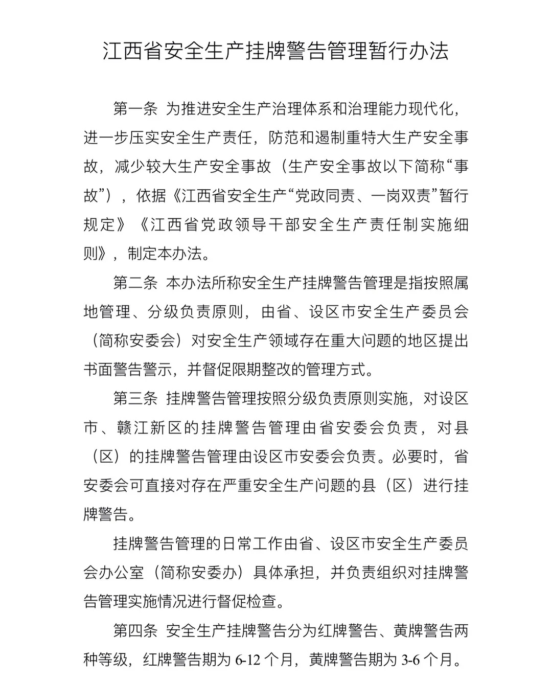 為深入貫徹習(xí)近平總書記關(guān)于安全生產(chǎn)重要論述,進(jìn)一步壓緊壓實(shí)地方各級黨政領(lǐng)導(dǎo)安全生產(chǎn)責(zé)任,持續(xù)推動我省安全生產(chǎn)領(lǐng)域改革發(fā)展。省安委辦依據(jù)《安全生產(chǎn)法》《江西省安全生產(chǎn)條例》《江西省黨政領(lǐng)導(dǎo)干部安全生產(chǎn)責(zé)任制實(shí)施細(xì)則》《江西省安全生產(chǎn)“黨政同責(zé)、一崗雙責(zé)”暫行規(guī)定》等法律法規(guī)和政策文件規(guī)定,在廣泛調(diào)研和征求意見的基礎(chǔ)上,牽頭起草了《江西省安全生產(chǎn)掛牌警告管理暫行辦法》(以下簡稱《辦法》),并于近日以省安委會名義印發(fā)。