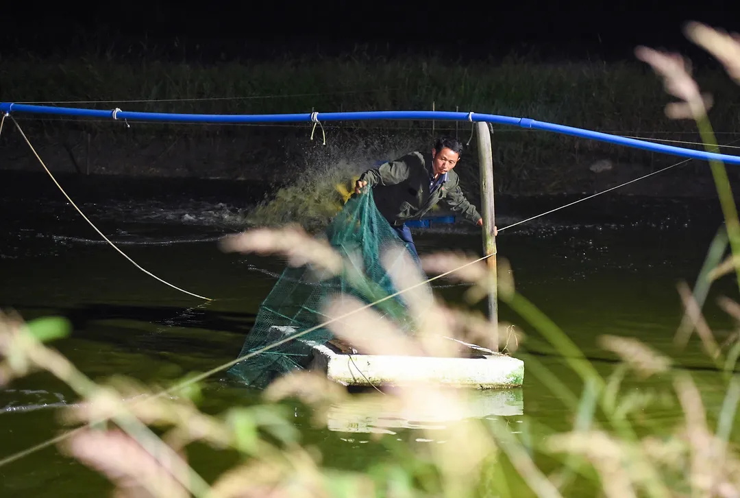 ▲9月20日晚,養(yǎng)殖戶放置地籠捕撈南美白對蝦(記者劉繼剛 攝)