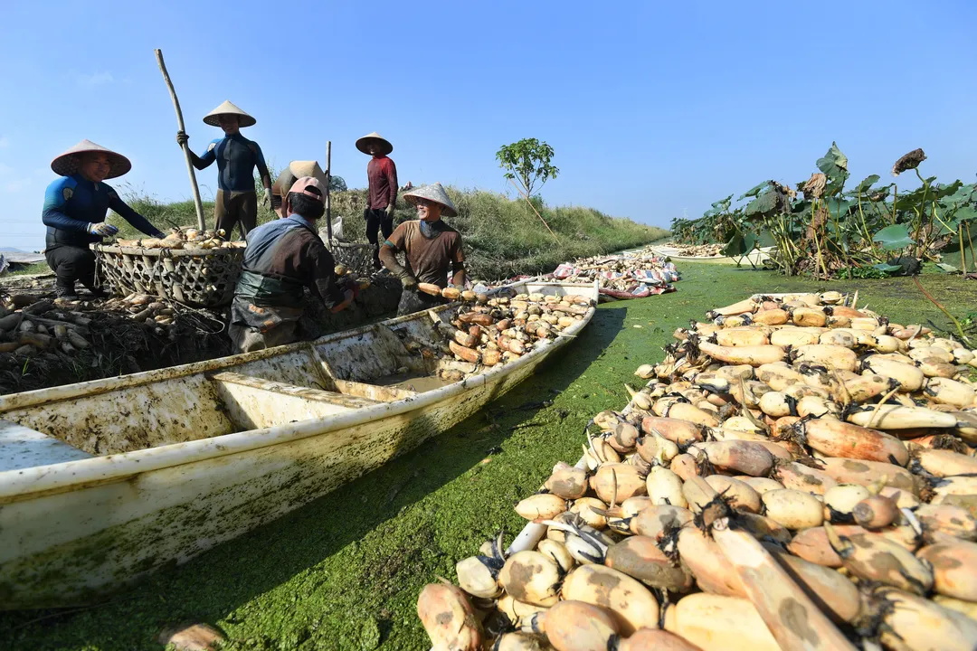 ▲9月15日,豐城市段潭鄉(xiāng)湖茫村村民在千畝蓮藕種植基地里采收蓮藕。(記者周亮 攝)
