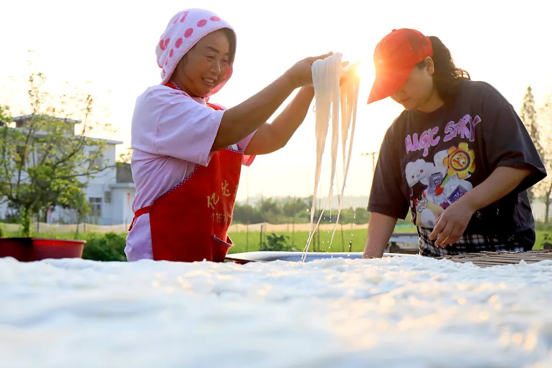 ▲宜豐縣棠浦鎮(zhèn)南坪村,粉農(nóng)王廣平夫婦涼曬傳統(tǒng)手工米粉。(何賤來 攝)