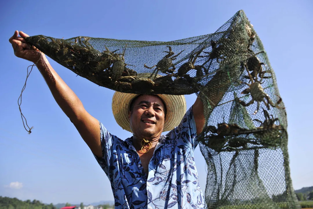 ▲9月13日,萬載縣三興鎮(zhèn)花塘村,蟹農(nóng)正在養(yǎng)殖水塘里收獲富硒螃蟹,準備銷往市場。(鄧龍華 攝)