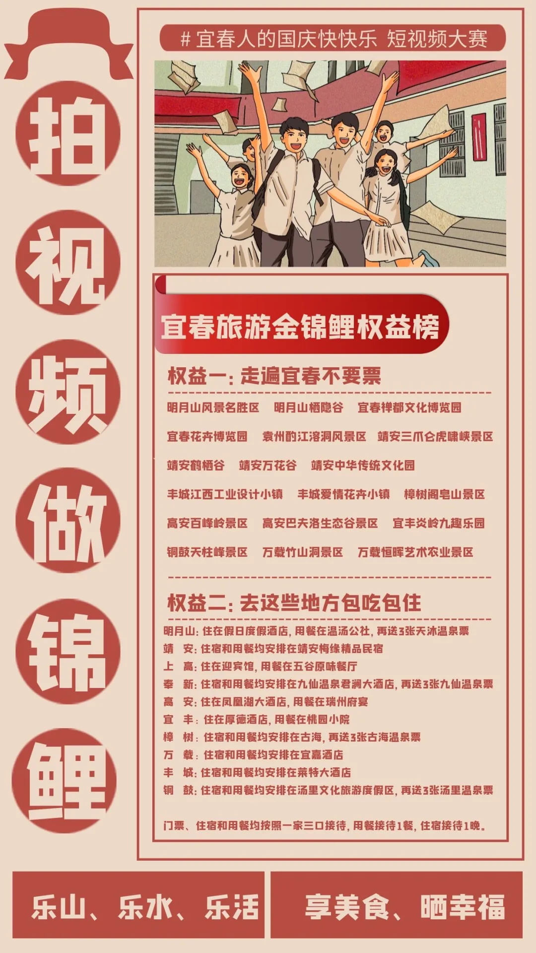 1.參賽作品要契合“樂(lè)山、樂(lè)水、樂(lè)活、享美食、曬幸?!敝黝},展現(xiàn)宜春人國(guó)慶假期的多種快樂(lè)打開(kāi)方式。