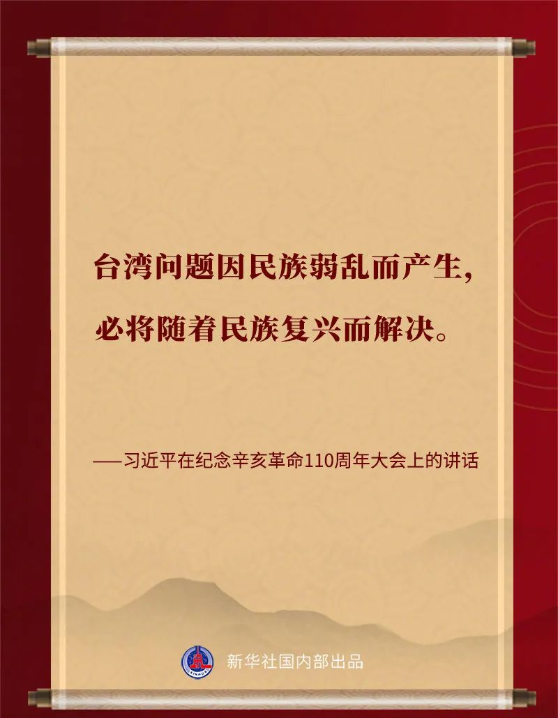 習(xí)近平說,中華民族具有反對分裂、維護(hù)統(tǒng)一的光榮傳統(tǒng)?!芭_獨”分裂是祖國統(tǒng)一的最大障礙,是民族復(fù)興的嚴(yán)重隱患。凡是數(shù)典忘祖、背叛祖國、分裂國家的人,從來沒有好下場,必將遭到人民的唾棄和歷史的審判!臺灣問題純屬中國內(nèi)政,不容任何外來干涉。任何人都不要低估中國人民捍衛(wèi)國家主權(quán)和領(lǐng)土完整的堅強(qiáng)決心、堅定意志、強(qiáng)大能力!祖國完全統(tǒng)一的歷史任務(wù)一定要實現(xiàn),也一定能夠?qū)崿F(xiàn)!