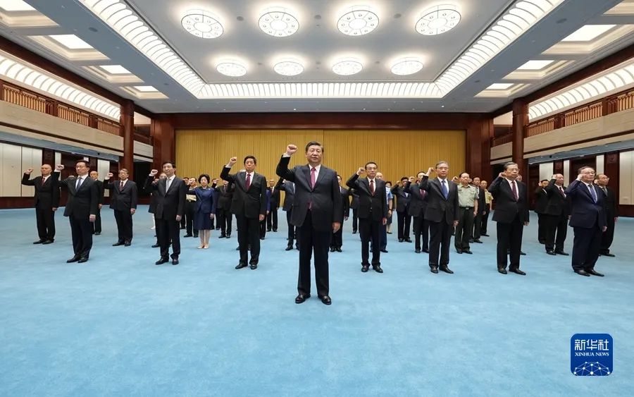 2021年6月18日,黨和國家領(lǐng)導(dǎo)人習(xí)近平、李克強(qiáng)、栗戰(zhàn)書、汪洋、王滬寧、趙樂際、韓正、王岐山等在中國共產(chǎn)黨歷史展覽館參觀“‘不忘初心、牢記使命’中國共產(chǎn)黨歷史展覽”。這是參觀結(jié)束后,習(xí)近平帶領(lǐng)黨員領(lǐng)導(dǎo)同志一起重溫入黨誓詞。