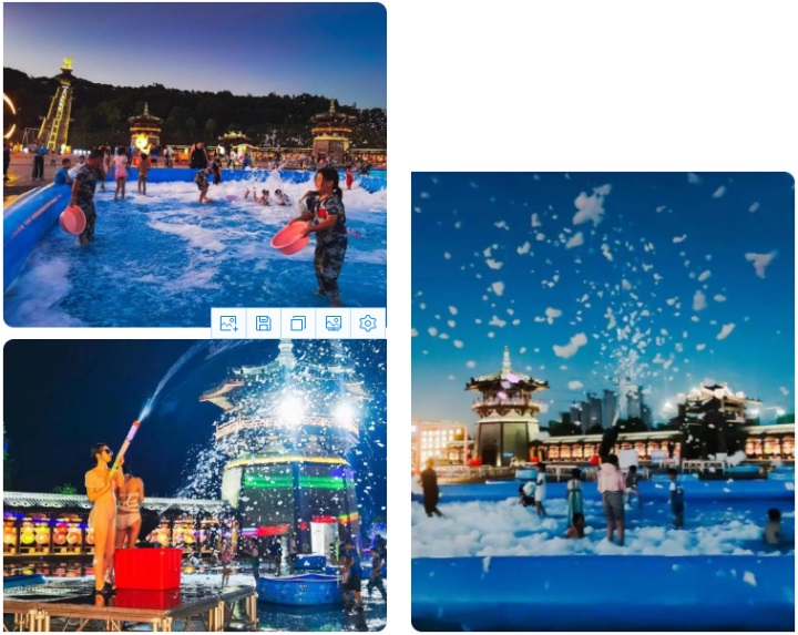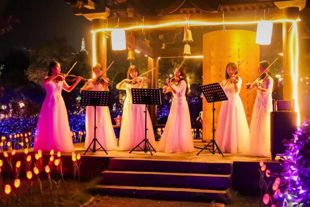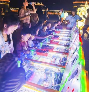 夜幕降臨,華燈初上,微風(fēng)拂面,落日余暉映照下的禪博園分外美麗。來自省內(nèi)外的游客、以及宜春四面八方的市民蜂擁而至,萬眾期待的夜游燈光秀華麗上演,數(shù)十萬盞LED燈以各種造型被同時(shí)點(diǎn)亮,星星點(diǎn)點(diǎn)的燈光將整個(gè)園區(qū)點(diǎn)綴得猶如璀璨的銀河一般奪目,通過將藝術(shù)燈光、全息投影等新技術(shù)有機(jī)結(jié)合,空間視錯覺與光影特效完美融合,游客身臨其境,沉浸漫步在宇宙太空之中。景區(qū)內(nèi)除了燈光秀,更有夏沫潑水節(jié)、套圈、撈魚等兒童喜愛的游戲攤位也是五花八門,應(yīng)有盡有,孩子們在家人的陪伴下玩得不亦樂乎,享受著夜晚難得的親子時(shí)光。